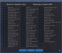 A Gladiator Match is a special kind of arena battle where each player commands a host of creatures, called "gladiators". These creatures are unlocked by collecting Gladiator Badges, displayed on the Gladiator tab of the Badge menu. You may choose your team of gladiators by selecting the "My Gladiators" button in the Arena Kiosk menu. All gladiators you have unlocked are listed along with their point costs. To build your team, select any gladiator from your list using the radio buttons next to it. The cost of that creature is automatically subtracted from your total points. You can have up to three creatures of the same type and cannot exceed the 2000 point limit. When you are done, select "OK" or "Apply". The game will remember your selections, and these gladiators will be your team for any Gladiator Match. You can return to the Gladiator screen and change your team selections at any time outside an arena battle.