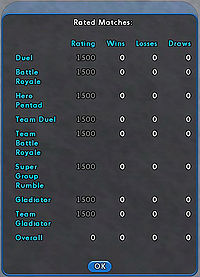 When you click the My Arena Rating button, you will be taken to a screen that shows your rating based on the number of wins, losses, and draws in each event type. These totals are cumulative over the life of the character.
