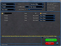 | Game Type | Victory Type | Victory Value | Level Range | Number of Teams | Max Players | Ground Rules | Battle Map | Rating |