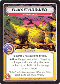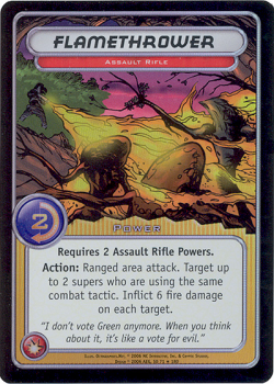 Action: Ranged area attack. Target up to 2 supers who are using the same combat tactic. Inflict 6 fire damage on each target.