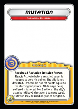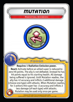 React: Activate before an allied super is reduced to zero hit points. The ally is not defeated. Instead he has hit points equal to his starting health. All damage being suffered is ignored. Until Mutation readies, the ally has +2 accuracy and inflict 2 additional damage (choose one type) with attacks. When Mutation readies, for 3 actions the super has -2 accuracy and inflicts 2 less damage (of each type) with attacks. Mutation may be used only once per game.