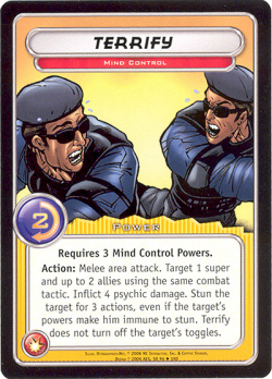 Action: Melee area attack. Target 1 super and up to 2 allies using the same combat tactic. Inflict 4 psychic damage. Stun the target for 3 actions, even if the target's powers make him immune to stun. Terrify does not turn off the target's toggles.
