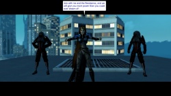 Belladonna:Character. I should have figured that Justin would send you. Belladonna: I was like you once. Until Justin tried to kill me. As you can see, it didn't take. Belladonna: He wants you to capture me, but I'm here to give you a different offer, and some insight... Belladonna: Once you become a threat, Justin will kill you, just as he has done to so many others in the past. Belladonna: Join with me and the Resistance, and we will give you more power than you could ever dream of! Belladonna: And... unlike Justin, we won't try to kill you when you get too powerful. What do you say, Character?