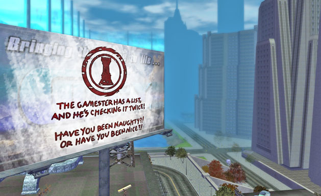 PARAGON CITY, RI, Dec. 19, 2005 – Paragon City awoke this morning to disturbing signs of a trickster planting “holiday gifts” throughout our fair city. Several billboards were spotted that had been vandalized - their proper images covered with a menacing logo of a red rook, and sporting the message: