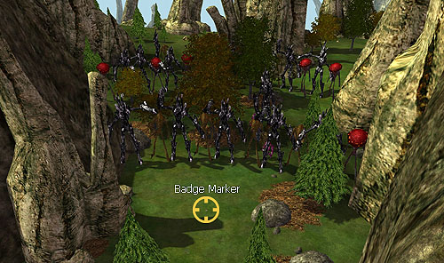 The Sound of Thunder badge is 558 yards west and a bit north of the Eden transfer point, in the middle of a valley guarded by two barricades of monsters off the southeast edge of the crater.