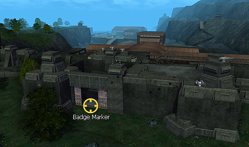 The Wolf's Maw badge is located 212 yards east of the Wolf's Throat marker, in the middle of the gated entrance to the Council base.