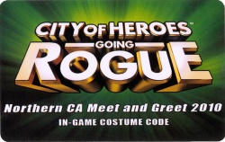 Game codes for this costume power were given out NCsoft's Northern California Meet and Greet on November 6, 2010. One code permanently unlocks this power on all characters (Heroes and Villains, current and future) for one account